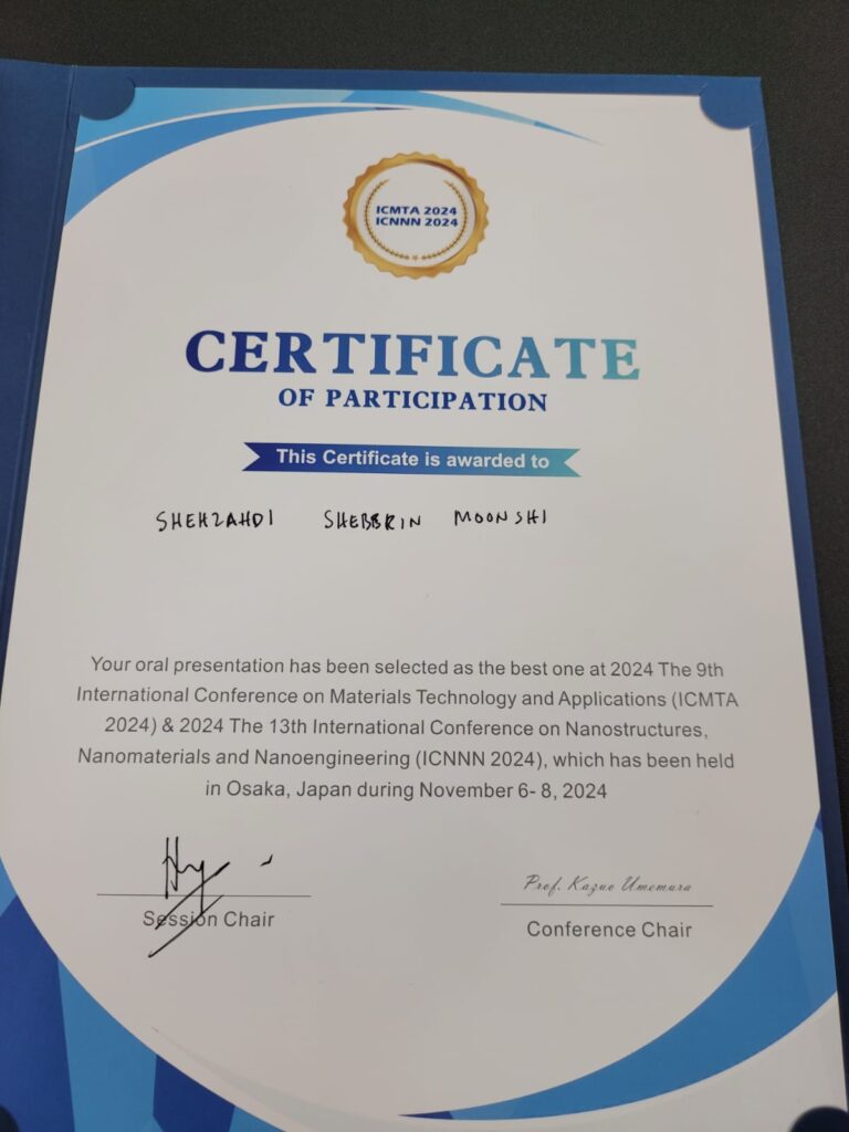 We celebrated a team member success. Dr Moonshi’s oral presentation has been selected as the best one at 2024 the 9th International Conference on Materials Technology and Applications (ICMTA 2024) and 2024 The 13th International Conference on Nanostructures, Nanomaterials and Nanoengineering (ICNNN 2024), which has been held in Osaka, Japan during November 6-8 2024.